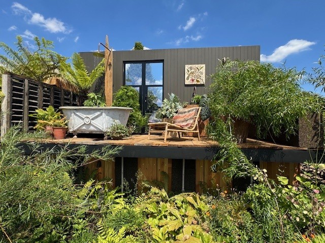 At the heart of the installation is a closed-loop water system. Grey water from a household shower is channelled into the bath, then directed up through a planted green roof for initial filtration. From there, water passes through further filtration and is finally distributed via underground irrigation pipes directly to the soil — ensuring only clean, filtered water nourishes the planting. The approach spotlights how simple, scalable solutions can support both sustainability and horticultural success.